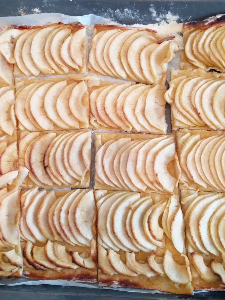 Voilà un dessert qui fait plaisir, rapide, léger et bon. La recette vient de Elle-à-table au départ. Une pate, des pommes, et zou: au four ! En fait, j'aime bien le faire sur une grande plaque, et ajouter de la compote de pommes sur la pate. Une autre recette presque identique proposait de la faire avec des pommes vertes. Plus acide mais intéressant !