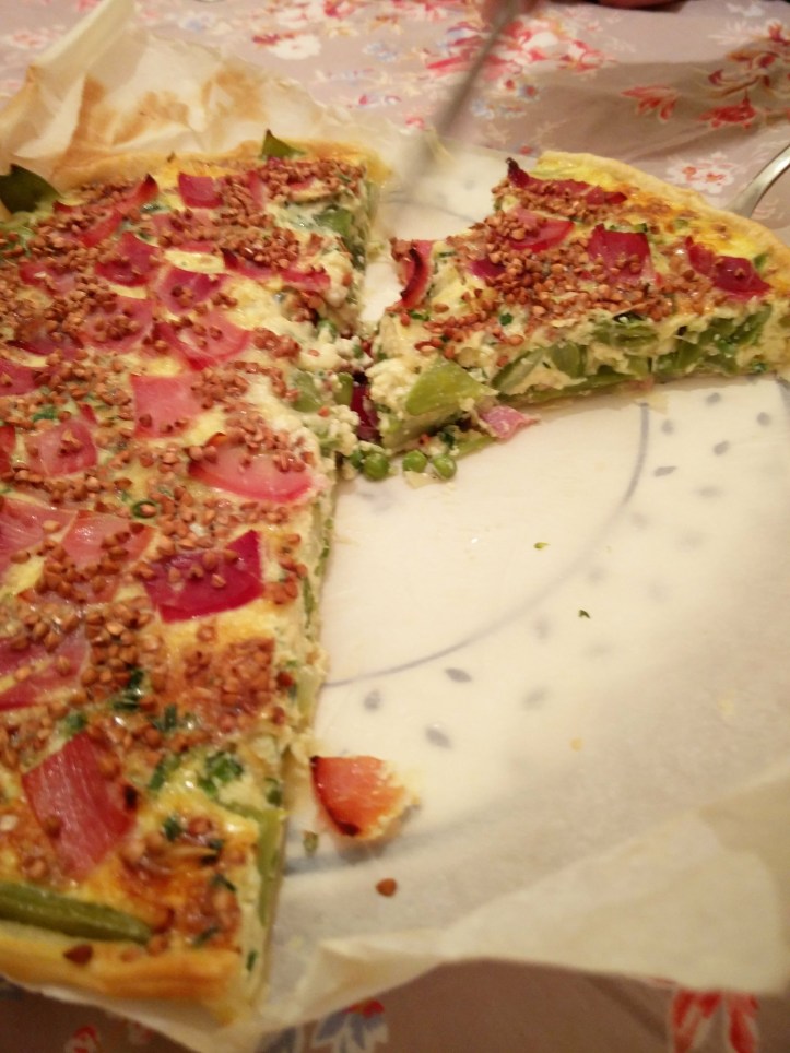 Pâte: 300g de farine de sarrasin – 150g beurre – 4cas eau – 1 cas vinaigre -1 oeuf – ou une bonne pâte feuilletée